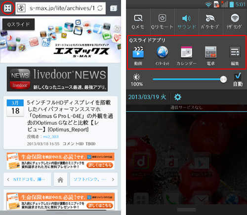 Qスライドは前機種である「Optimus G L-01E」(NTTドコモ)及び「Optimus G LGL21」(au)にも搭載されている動画を観「ながら」他のことができる機能です。