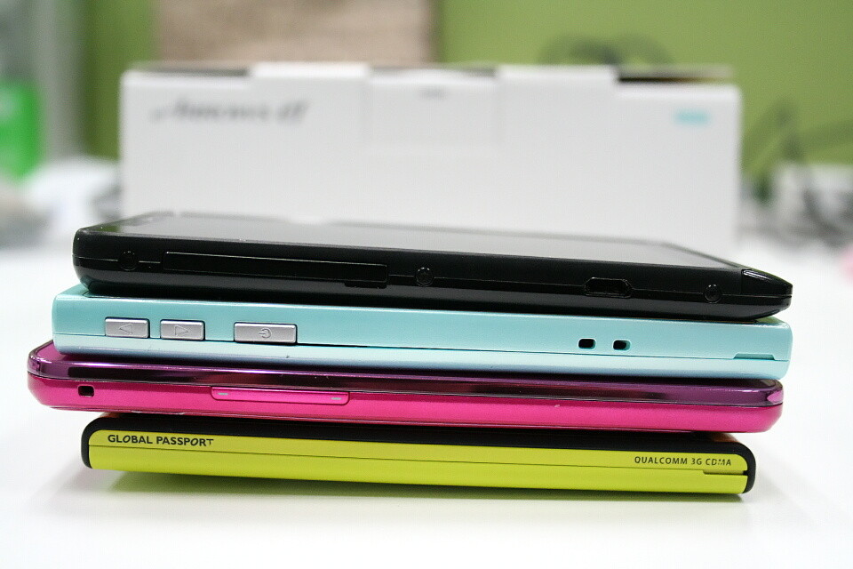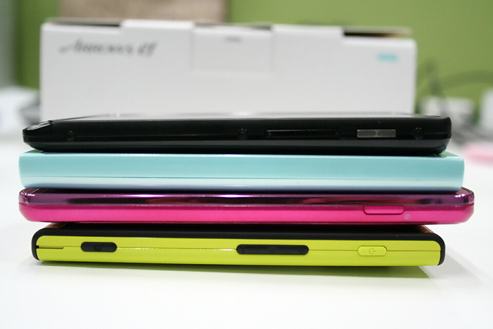手元にあったスマートフォンと並べてみた。MNP元となった201M以外はau向けのスマートフォンだ。GALAXY SII WiMAX ISW11SCもピンクカラーのシャイニーマゼンタを待って購入したが、今回のFJL21のソフトブルーが凄まじくかわいい。どちらの機種も、ポイントはやはりベゼル部分(ディスプレイ周りの額縁部分)もしっかりカラーリングされている点だ。本体カラーは素晴らしくお洒落や可愛くてもベゼルが普通にブラックだと良さが半減してしまうと感じるのは筆者だけではないだろう。