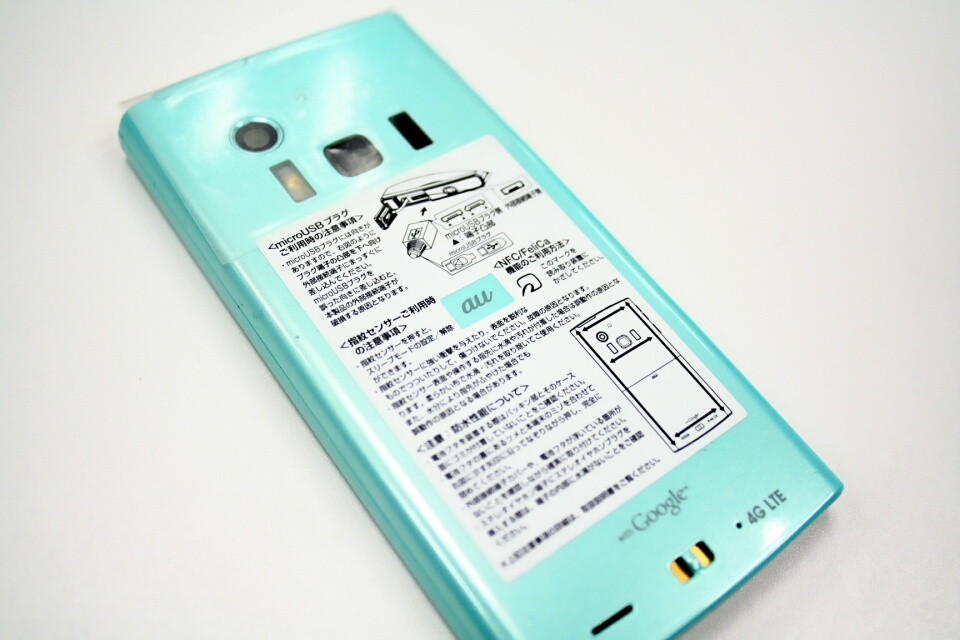 特に国内メーカー製には多いが、新品状態だとなにやら本体にベタベタと保護のような説明のようなシートやシールが貼られている。FJL21では、正面に近接センサー、ワンセグアンテナ、背面には、microUSBプラグ、指紋センサー、NFC/FeliCa、防水性能について、あるいは注意事項が記載されている。ひとまずこのシートとシールを剥がす。