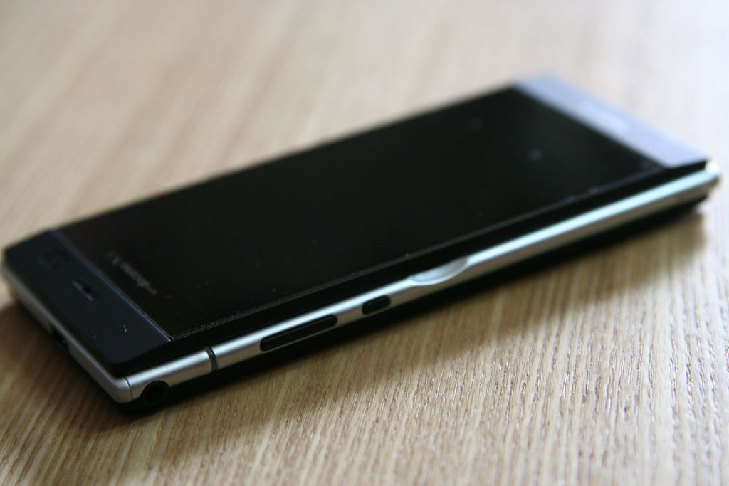 閉じた状態では左側面にイヤホンマイク端子、お知らせLED、音量ボタン、電源ボタンが配置されます。
