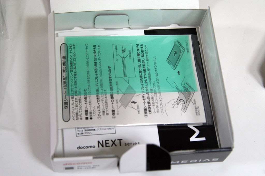 パッケージには、MEDIAS W N-05E本体および保証書、液晶保護シート(試供品)、クイックスタートガイドが入っていました。