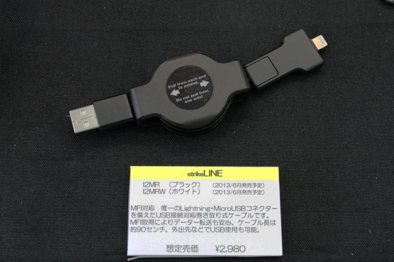巻き取り式リールケーブルとしては非常に珍しい、MFi認証(Appleの策定した技術基準などをクリアした機器へ与えられる認証)を取得したmicroUSBおよびLightningのマルチケーブルです。