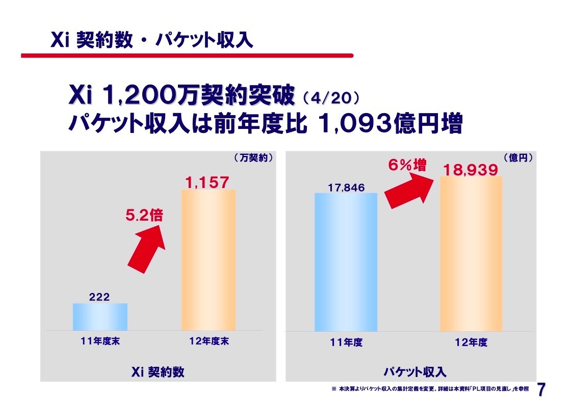 決算説明会では、Xiの契約者数が2011年度末に222万契約だったのに対し、2012年度は5.2倍にあたる1157万契約になったと説明。その後、4月20日に1200万契約に到達したという。