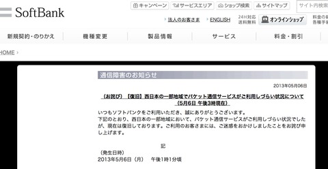 ソフトバンクモバイルは6日、西日本の一部地域において2013年5月6日(月)午後1時1分頃から携帯電話サービスにおけるパケット通信が利用しづらい状況になっていたことをお知らせしています。同日午後3時現在のお知らせとして、復旧していることが案内されています。