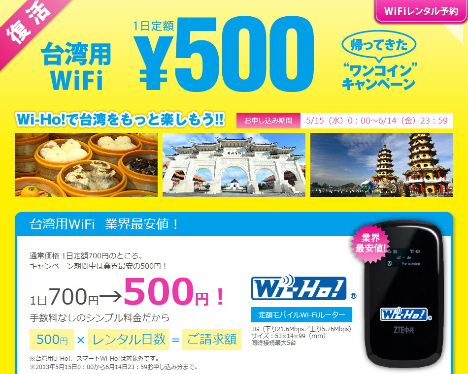 キャンペーン対象 :台湾用のWi-Ho! 1日500 円/台(不課税)