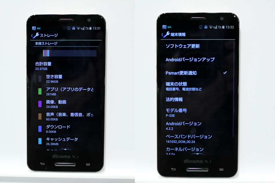展示機で確認したところ、Androidのバージョンは4.2.2、内蔵ストレージは32GBでアプリなどを保存するための空き容量(ユーザー領域)は、20GBを超えていた。また、CPUは1.7GHzのクアッドコア(APQ8064T)、RAMは2GBとなっており、現行のAndroidスマートフォンでは、充分にハイスペックと言える仕様だ。