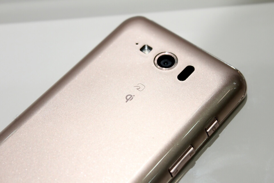 背面には有効画素数約1340万画素の表面照射型CMOSカメラを搭載し、カメラ周辺にはライト、赤外線通信ポートのほかFeliCa、Qi(チー)のロゴマークが見える。ワイヤレス充電規格のQiに対応したおくだけ充電の機能を搭載している。