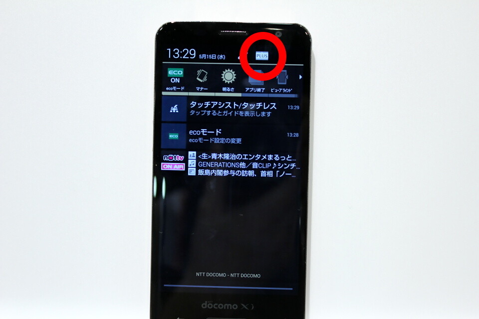 ステータスバーを下げて通知エリアの中にある「PLUS」アイコンをタップ、もしくはホームボタンを2回連続押すことで、画面下部のエリアに表示が表れる。ここでは、起動中のアプリを一括終了やアプリの切替ができる「タスクマネージャーPLUS」と、ブラウザやYouTube、ワンセグなどを小画面として表示できる「ウィンドウPLUS」の操作ができる。ブラウザでWeb画面を表示中にワンセグを見るといったことが可能だ。