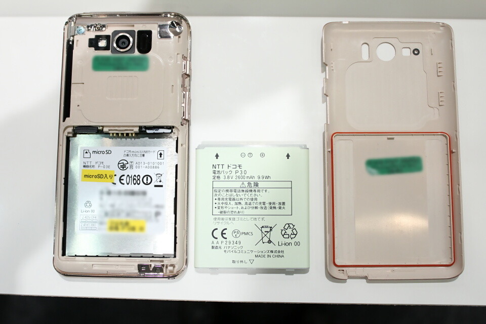 P-03Eは、IPX5/IPX7等級の防水性能およびIP5X等級の防塵性能に対応しているため、本体上部側面のmicroUSB端子のカバーとリアカバーの内側には液体の侵入を防ぐパッキンが取り付けられている。電池パックはP30、3.8V 2600mAh 9.9Whのものが使われていた。2000mAhを大きく超えるバッテリー容量となっている。