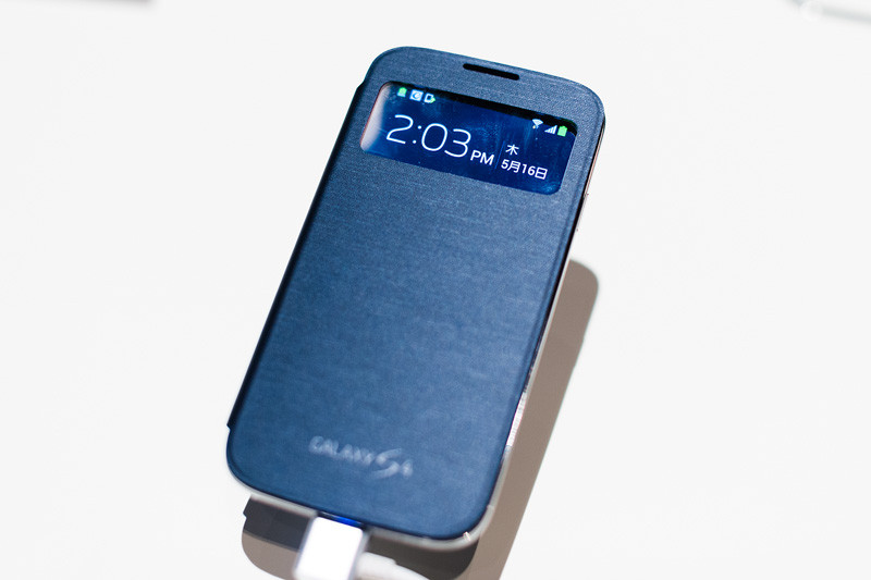 GALAXY S4専用のアクセサリーとして「S View カバー」が紹介された。GALAXYシリーズではお馴染みのリアカバーを外して利用するフリップカバーだが、あらたにカバーと連動してウェイクアップしたり、カバーを閉じるとカバーの窓の部分に時計が表示されるといったギミックが紹介された。