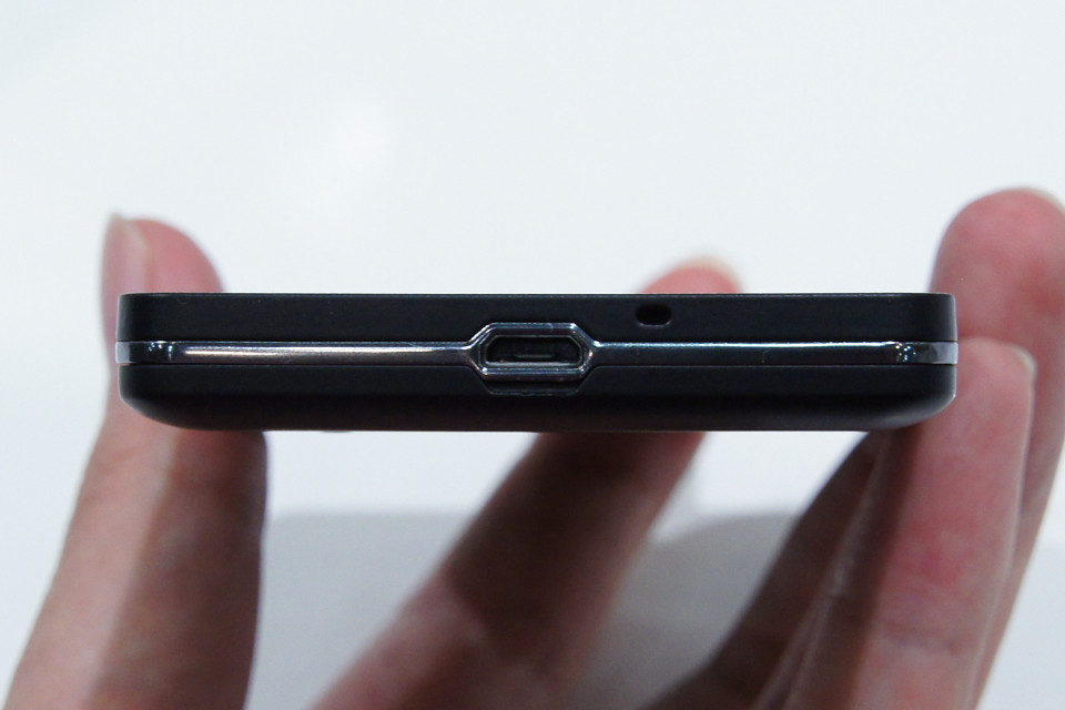 下面。microUSB端子をメタルベゼルが囲むデザインは高級感がある