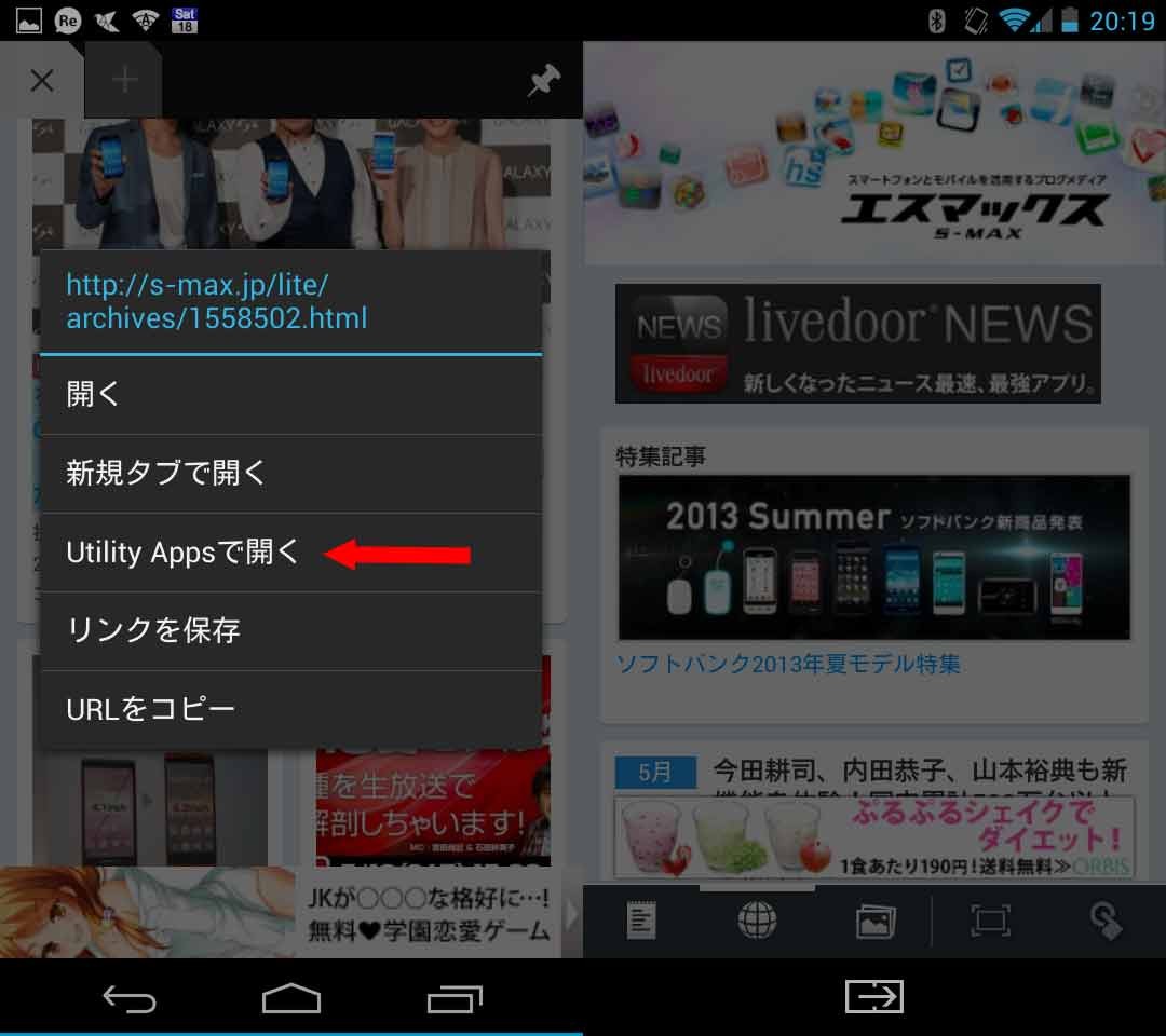 Utility Appsブラウザのリンクを長押しして、メニューから「他のブラウザで開く」を選択すると左画面でリンクが展開します。