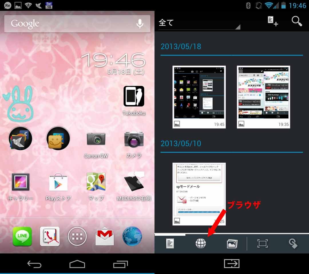 そこで今回は、MEDIAS W N-05Eの2画面でブラウザを表示する方法を紹介します。