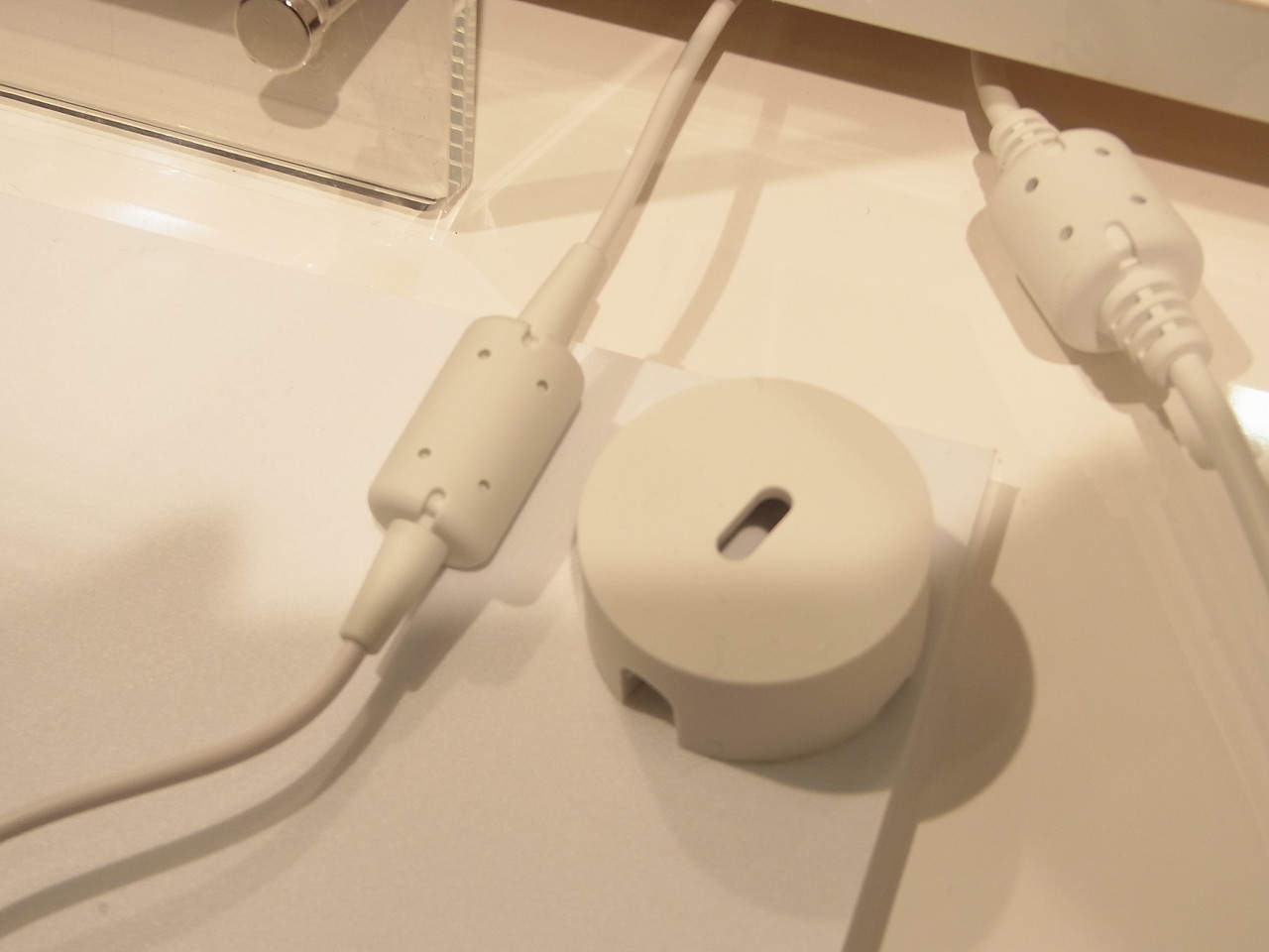 ワイヤレスチャージャー03に接続するケーブルは丸型のものとなっています。製品企画案ではスマートフォンを充電するのにも利用できるmicroUSBにする声もあったそうなのですが、同説明員曰く「規格上ワイヤレスチャージャー本体に昇圧機構を入れないといけないため、そうすると安価にできないということで、従来と同じ丸型になった。」ということだそうです。