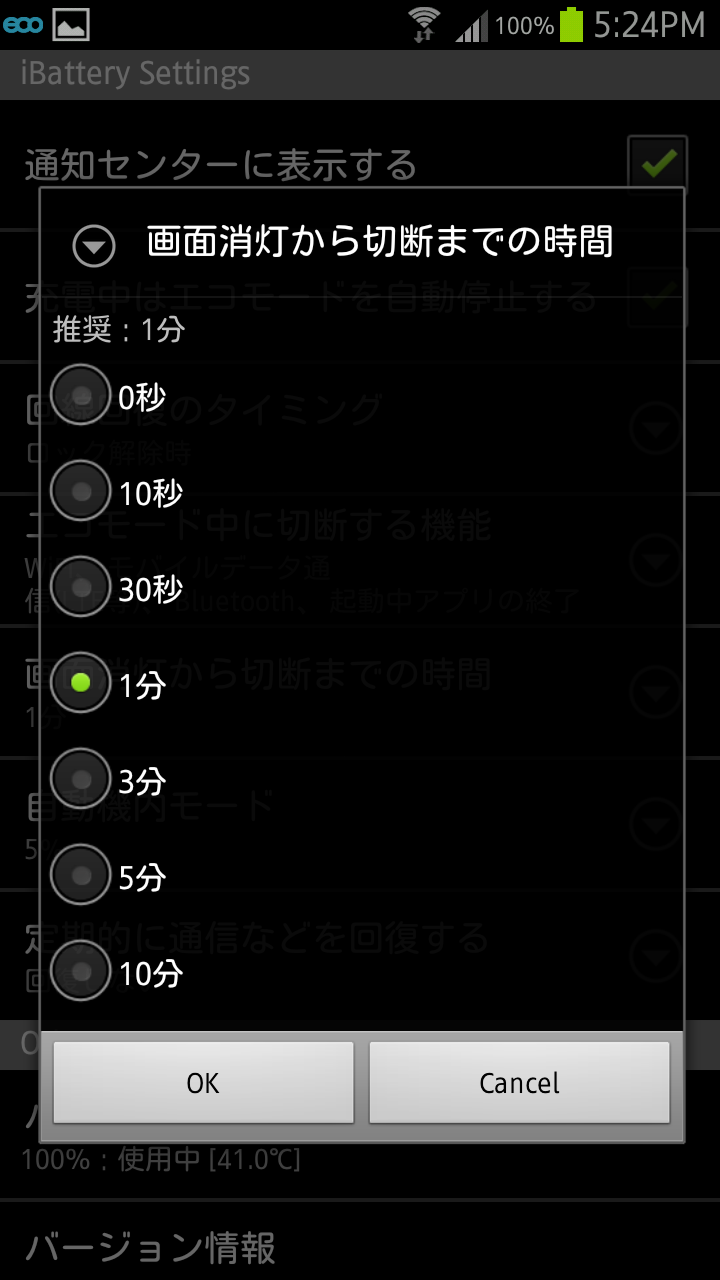 画面が消灯してから切断するまでの時間を0秒~10分の間で設定します。推奨は1分となっています。
