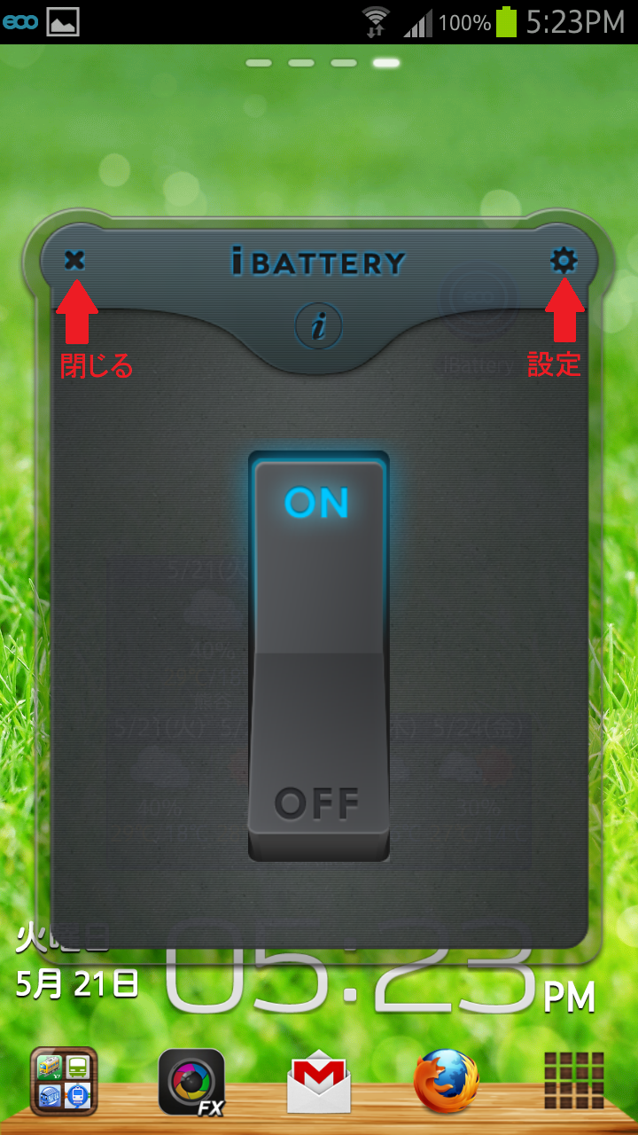 スイッチをON/OFFする間隔で節電もON/OFFすることができます。右上の歯車アイコンから節電内容をカスタマイズすることができ、左上のバツアイコンをタップしてアプリを閉じることができます。