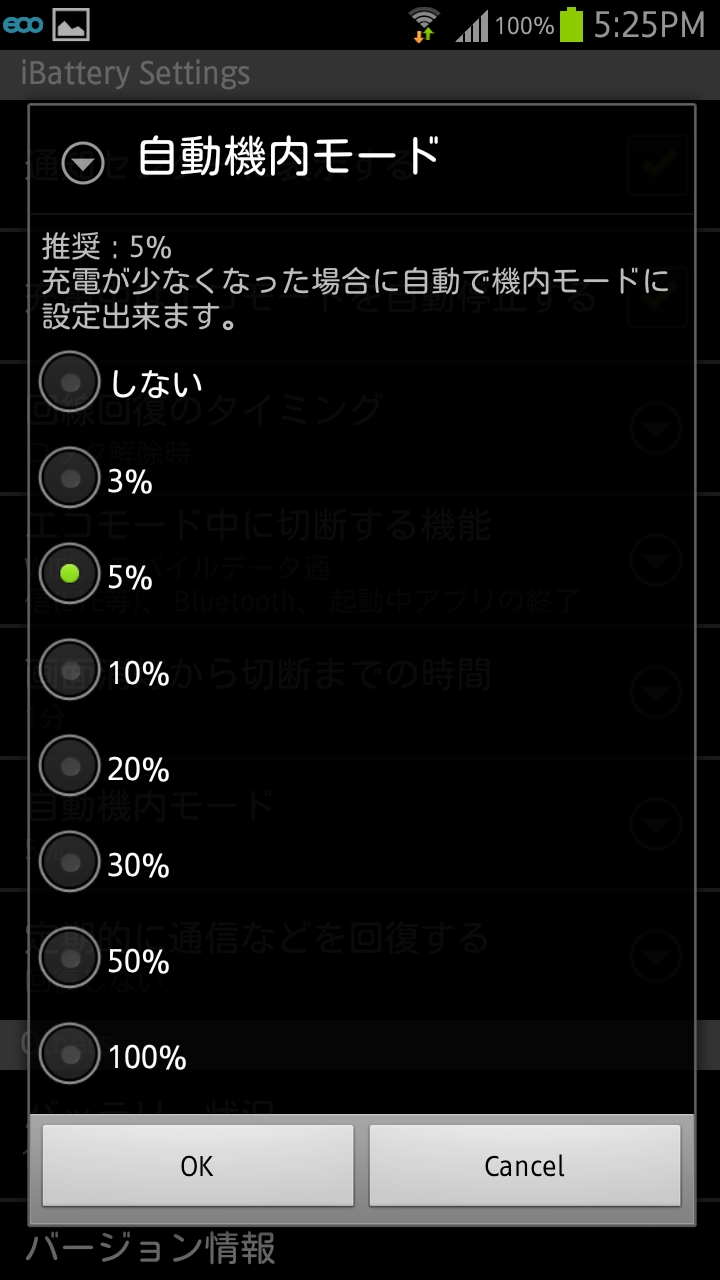バッテーリーが少なくなってきたときに自動で機内モードに切り替えることができる設定です。バッテリー残量%での選択となり、推奨は5%となっています。