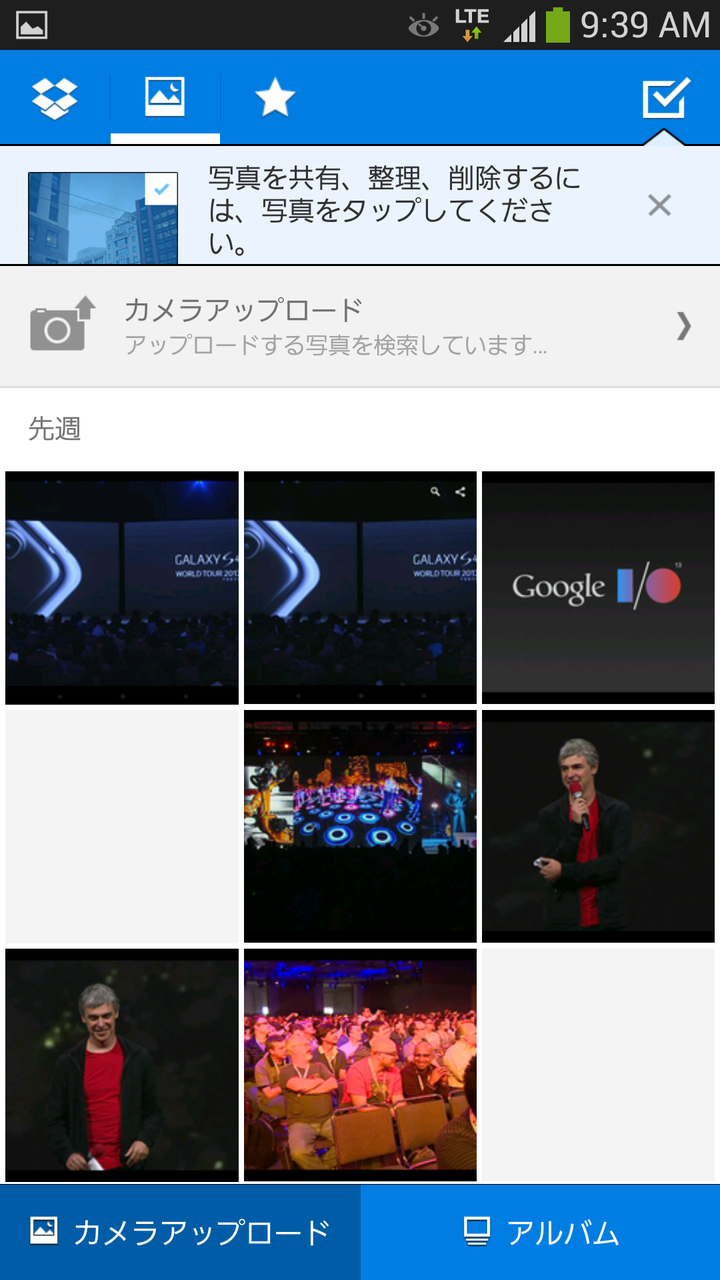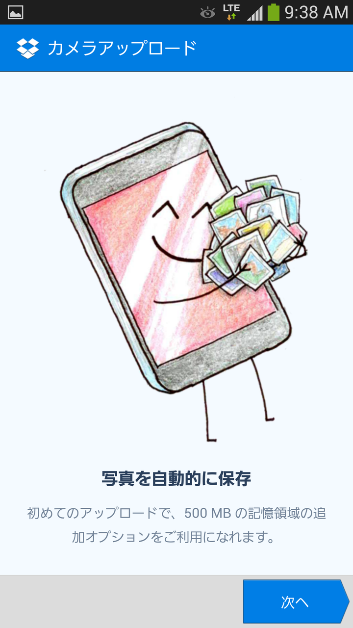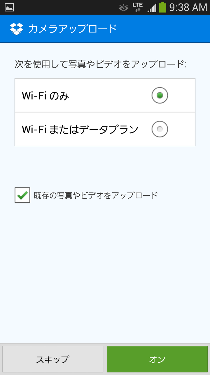 ログインしたらカメラアップロードの設定を行います。カメラアップロードは、GALAXY S4 SC-04Eのカメラで撮影した写真や、スクリーンショットなどを自動的にDropboxにアップロードする機能で、初期設定のままですと、無線LAN(Wi-Fi)接続時のみにアップロードするようになっています。
