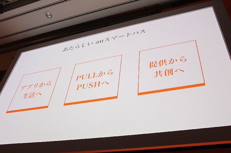 「次のステージ。『Simple&Luckyに。』というキャッチコピーでやっていく。アプリやクーポンなどに加えて、生活に役立つ情報を取り揃える。ライブ感のあるライムライン(TL)で表示で、情報が次々に更新される。特にこの2軸の真ん中にauスマートパスをもっていきたい。いわゆるプル型からプッシュ型に変える。画面の中の世界から、リアルにつなげる。新しいスマートパスは、3つの側面がある。アプリから生活へ、スマホとリアルな生活をリレーション。そのために、リアルでプレゼンスがある企業にパートナーとして賛同いただき、スマホとリアルな生活をリレーションしていく。例えば、すでにぴあの話が新聞に出ていたが、ぴあとコラボすることで、スマパス限定先行チケット販売や限定映画試写会、などをプッシュでスマホに送り届けたい。プッシュのイメージはこんな感じ。スマパスのアイコンを立ち上げると5~15分に新しい情報が次々とプッシュされる。豊富な情報が更新され、気に入ったものがあれば、それをタッチしてシンプルに詳細を確認できる。ここにドラゴンボールがありますけど、新しいのがリリースされたというのをタップするとダウンロードできる。さらに、きゃりーの情報がパッと出たら、ちょうどライブの情報ですけど、そのままフル画面で観ることができる。このようにシンプルな使い方ができる。」とした。