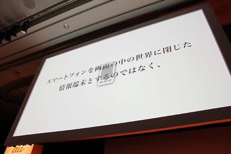 これらを実現するための製品として、2013年auの発表に移った。田中氏曰く「スマホを使いこなすをサポートするキャリアへ。画面に閉じた情報だけでなく、もっと先に進めたい。買い物するときにスマホがサポートしてくれたら、電車にのるときにサポートしてくれたら、レジャーのときにサポートしてくれたら……スマホと生活をつながっていく可能性をひとつずつサービス化していく。前置きはこれくらいにして。」として「3M戦略第2弾として『スマートリレーション構造』を現実化したい。そんなサービス・イノベーションを進めて行きたい。」と紹介した。