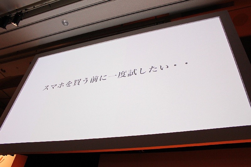 A. 50%なる。スマホを利用するのは全体の8割まで時間をかけて進んでいくんではないか。今こんなサービスをはじめたのは、スマホを使ってしまう、慣れてしまうと新たな発見があるのに、どうしてもはじめの初期設定がうまくできなかったり、使い方がわからなかったりというように諦めてしまうという人がいる。木村ともいつも言っているが。そういう人にぜひともお伝えしたい。使い方を教えたい。そんな思いからできたサービス。ケータイはラインナップに入ってないが、出さないということではないが、秋以降出てくる。ケータイからの乗り換えでUIが使いやすいようなものを揃えている。
