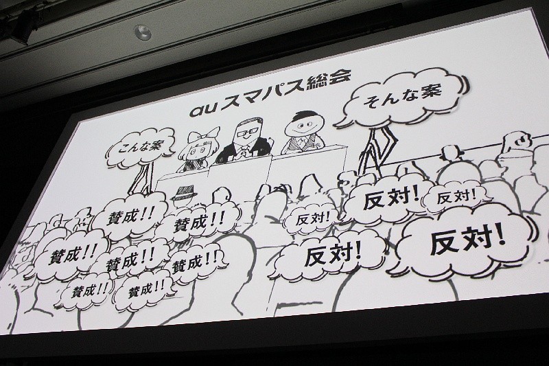 次に「提供から共創へ。『スマパス総会』をやりたい。auスマートパスの会員向けにユーザーに集まってもらって総会をやる。毎月テーマを決めて、何をしていくのか投票で決めたい。投票結果や要望への対応状況をリアルタイムで提供する。ユーザーが欲しいサービスをユーザー投票で提供するかどうか決定される。」とした。これは、ソフトバンク代表取締役社長の孫正義氏がTwitter上でユーザーからの意見を採用し、「やりましょう。」としたものが実現される仕組みを意識し、「au版やりましょう。」とも紹介された。