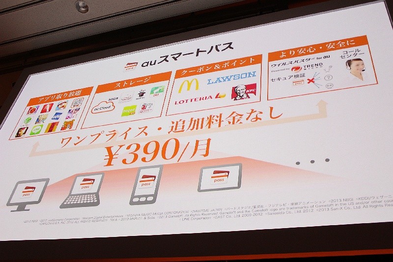 KDDIおよび沖縄セルラーは20日、au向けに2013年夏以降発売予定の新モデル・新サービスを披露する「2013年夏モデル 新商品・新サービス 発表会」を都内で開催し、Androidスマートフォン4機種や高速データ通信サービス「4G LTE」の受信時最大100Mbps化、3M戦略第2弾として「スマートリレーション構想」、第1弾のスマートパスポート構想にも3つめのサービスとして会員制の有料サポート「auスマートサポート」を追加するなどを発表した。