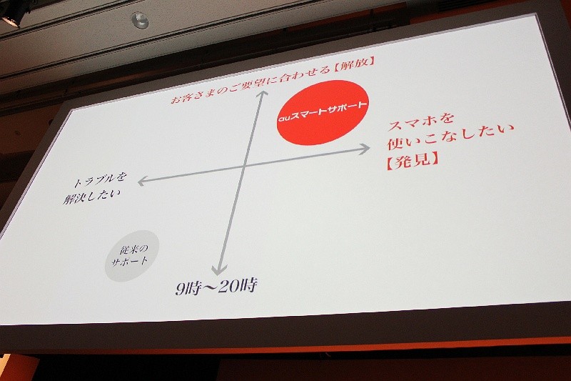 続けて「では、auは何をめざすのか?というと、ちょうどauのロゴの上に書いてある『新しい自由』をめざしていきたいと思っている。でも、それってなんなの?というように思うだろうが、4つの座標軸で説明したい。」とし、「客視点、。これらを満たしながら、最も革新のブランドでありながら、最もお客さま視点のブランドを追求していきたい。」と述べた。