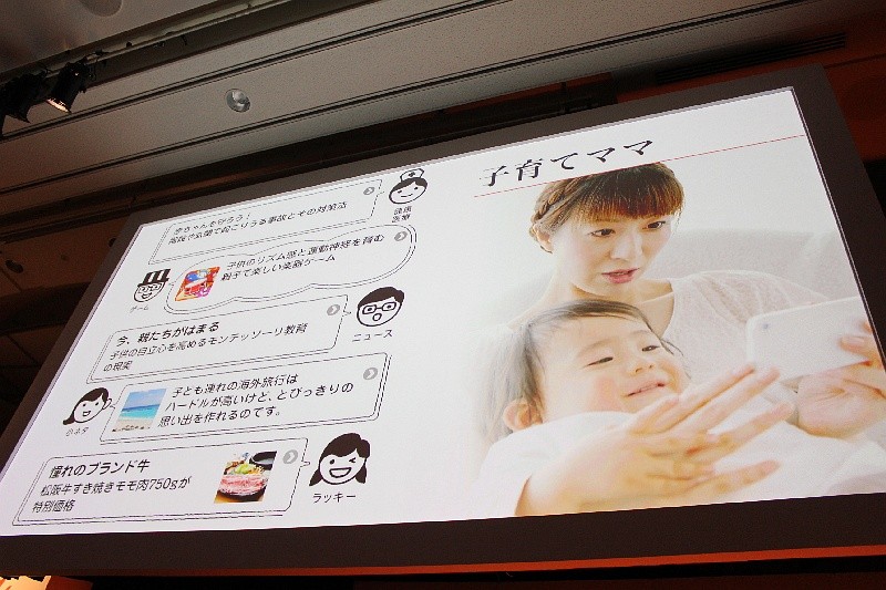 一方で「ラッキーはどうなの?」とし、「例えば、ロールケーキの情報が出てくる。こんな感じでパッと、プレミアムロールケーキ無料券が出てくる。いろいろな情報が出てくるが、映画のチケットの先行予約など、どんどんどんどんラッキーでお得な情報を出していきたい。スマホを通してリアルと連携できるようなことを『Simple&Luckyに。』」と説明した。