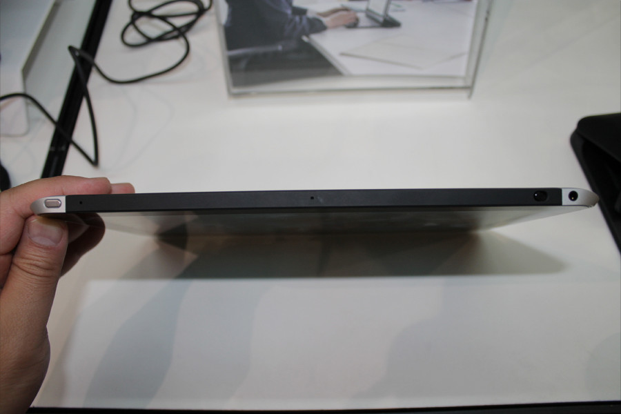 本体カラーは、アルミニウム削り出し筺体なので、アルミニウムカラー1色のみ(スペックシートに色の名称表記なし)。ディスプレイは、10.1インチWXGA(1280×800ドット)の5点タッチ対応のタッチパネル液晶を搭載しています。サイズは、大きさが約261(幅)×178(高さ)×9.2(最薄部の厚さ)mmで、質量が約630g。