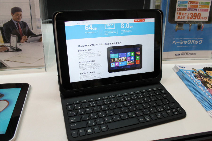 本記事では、展示会場内における「中小企業モバイル応援フォーラム」内のKDDIコーナーにて、先日発表されたLTEモジュール内蔵の日本ヒューレット・パッカード(以下、hp)製Windows 8タブレット「HP ElitePad 900 for au(型番:E1Q17PA#ABJ)」(以下、ElitePad 900)が展示されていたので写真で紹介します。