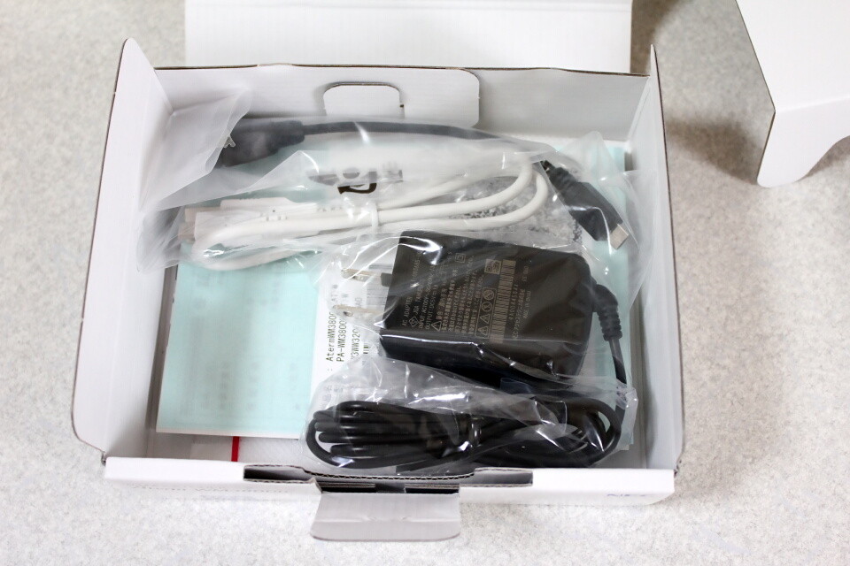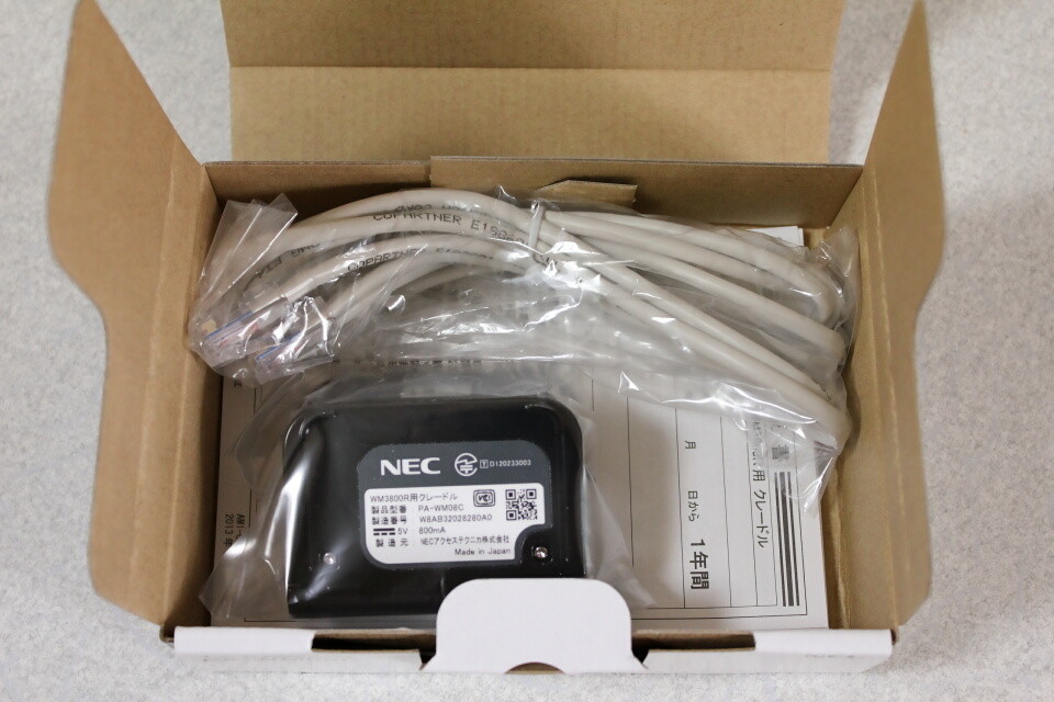 今回購入したモバイルWi-FiルーターはNECアクセステクニカ製の「AtermWM3800R クレードルセット」だ。まずは、内容物の確認と、WM3800Rの電源を入れる。WM3800Rにはディスプレイが搭載されているので「回線契約中」の表示で利用できるかどうかがすぐに確認できる。