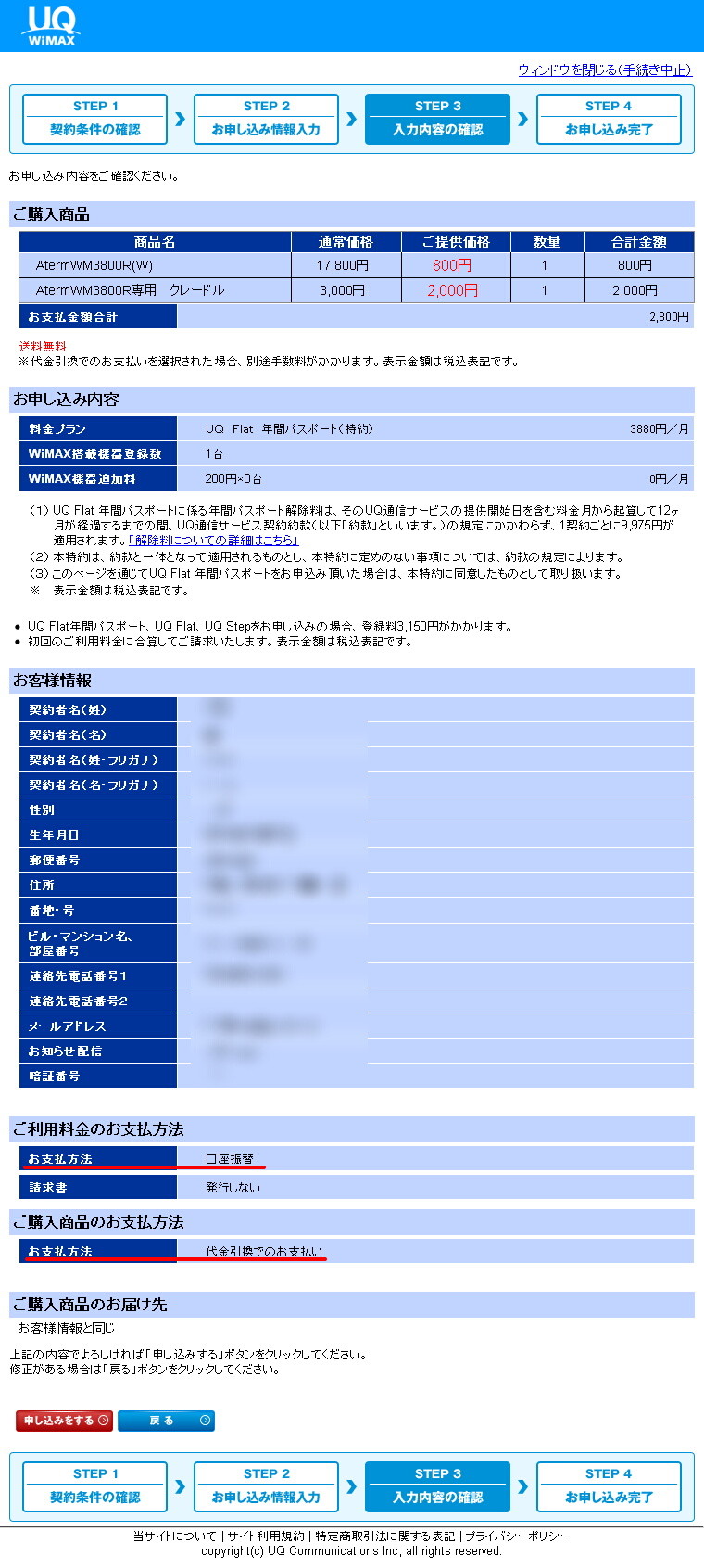 申し込み情報の入力画面では、申し込み者の名前、住所などを入力し、その後、画面をスクロールすると「ご利用料金のお支払い方法」が表示される。ここで、「口座振替」を選択する。さらに本体の代金を支払う「ご購入商品のお支払い方法」もクレジットカードを利用しない場合は「代金引換」を選択する。