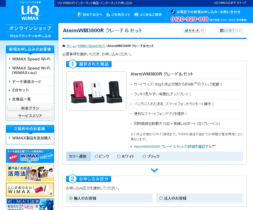 商品ページで、本体の色を選択、申し込み区分で「個人のお客様」「法人のお客様」を選択、今回は個人契約なので「個人のお客様」を選択した。