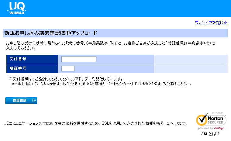 「新規お申し込み受け付け完了のご案内(自動送信メール)」の「書類アップロード」に記載されているURLをクリックするとブラウザ上に「新規お申し込み結果確認/書類アップロード」の画面が表示される。メール内に記載されている「受付番号」と申し込み時に入力した「暗証番号」を入力して「結果確認」をクリックする。