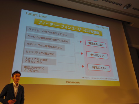そこで、フィーチャーフォンユーザーが持っている不安を解決する必要があります。河合氏は、その不安を大きくまとめると“電池が持たない”、“使いにくい”、“持ちにくい”の3点に集約できると説明します。