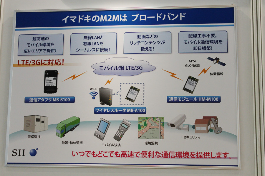 本記事では、セイコーソリューションブース内のワイヤレスM2Mのコーナーにて、セイコーインスツル製LTE(Long Term Evolution)と3Gに対応した新しい組み込み機器向けワイヤレス通信モジュールが展示されていましたので紹介します。