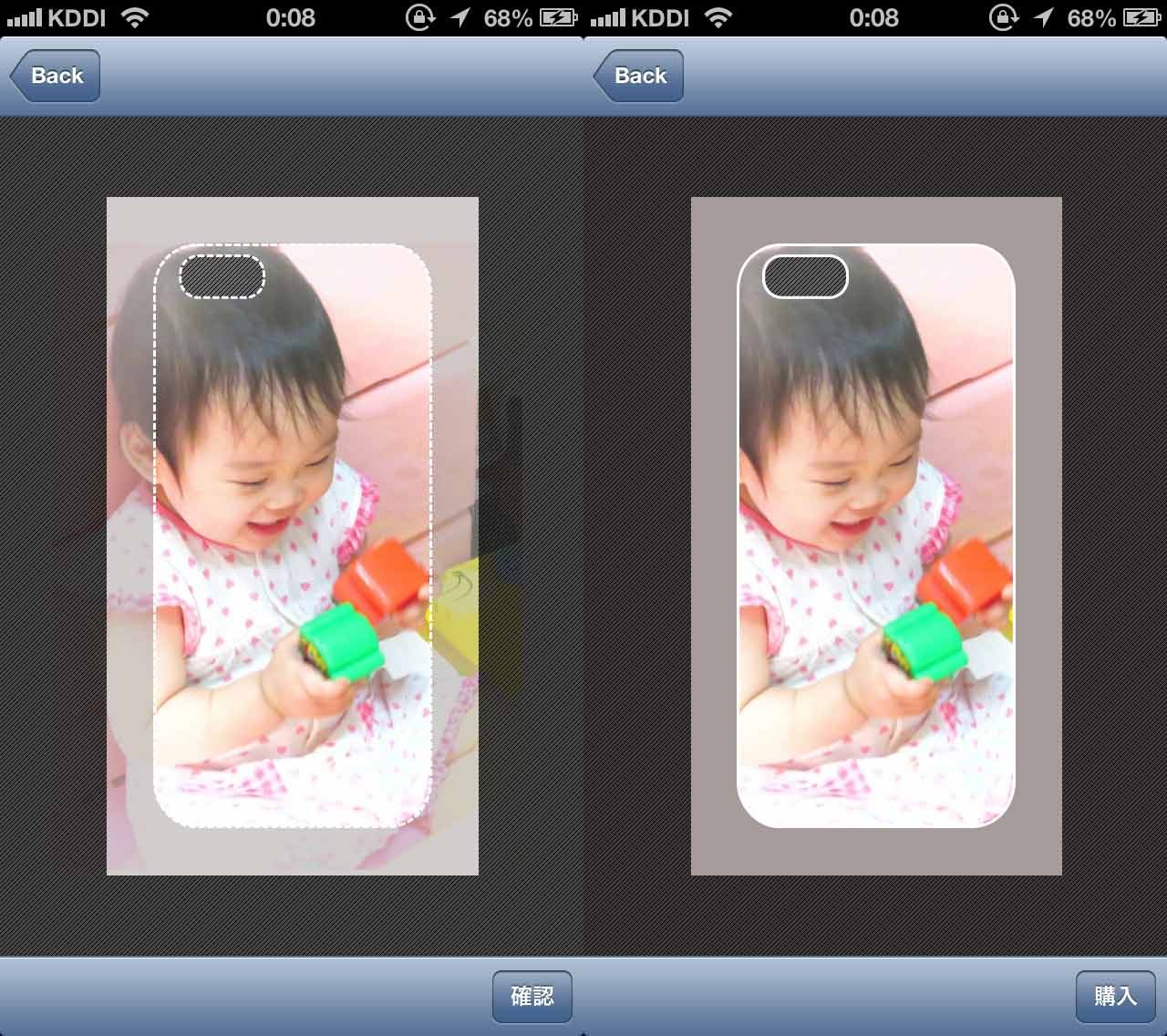 写真は拡大縮小、移動、回転が自在にできます。iPhoneの形に合わせてレイアウトしましょう。完成したら「確認」を押すと、iPhoneの周りがトリミングされます。このデザインでよければ「購入」をタップしましょう。