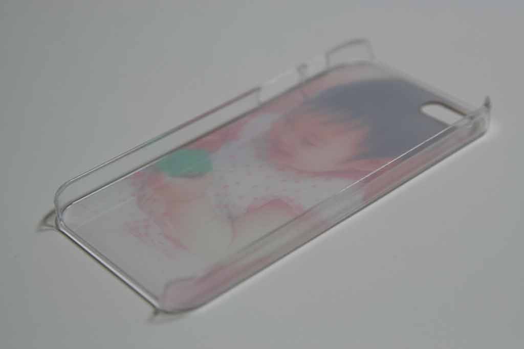 裏面は本来のケースの透明プラスチックに印刷面がうっすらと透けて見えます。縁は透明なままになっています。
