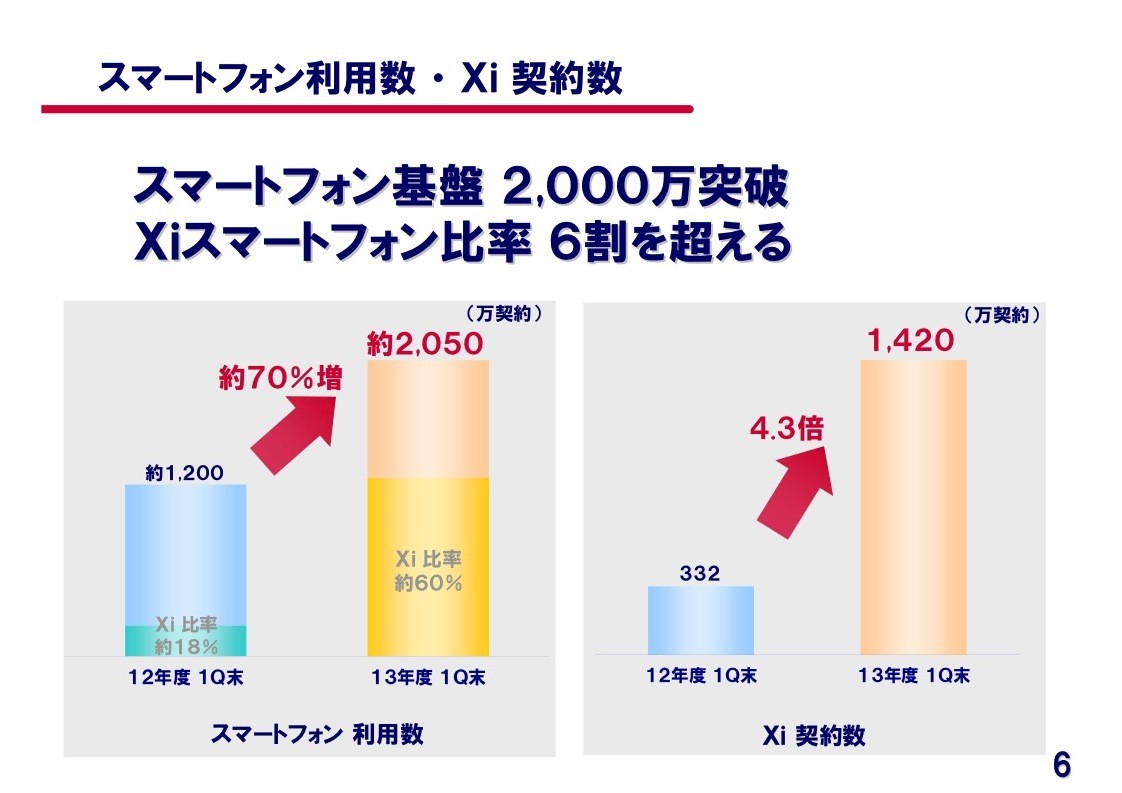 また、スマートフォン利用数やXi契約数も順調に増加しており、スマートフォン基盤が2000万を突破し、前年同期比約70%増の2050万台に到達したとのこと。さらに、Xi対応スマートフォンの比率は2012年Q1では18%だったのに対し、2013年Q1では6割を超えています。Xi契約数も2012年Q1に332万契約だったのが、2013年Q1には4.3倍となる1420万契約となっています。