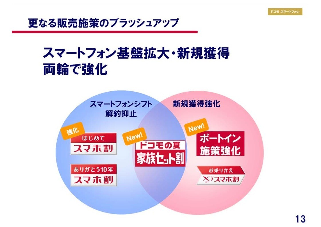 一方で、想定していたフィーチャーフォンからの乗り換えには一定の効果があったとしながらも、もう1つのMNPポートインへの効果はもう少し転入が望めると考えいたとし、純増数で苦戦していることからさらなる販売施策のブラッシュアップを行い、スマートフォン基盤拡大・新規獲得の両輪で強化していくとし、スマートフォンシフト・解約抑止として「はじめてスマホ割」の対象機種増加や「家族セット割」の開始を行い、さらに、新規獲得強化としてポートインに向けた施策強化を実施しています。なお、7月はMNPポートインも改善しており、手応えを感じていると加藤氏は語っていました。