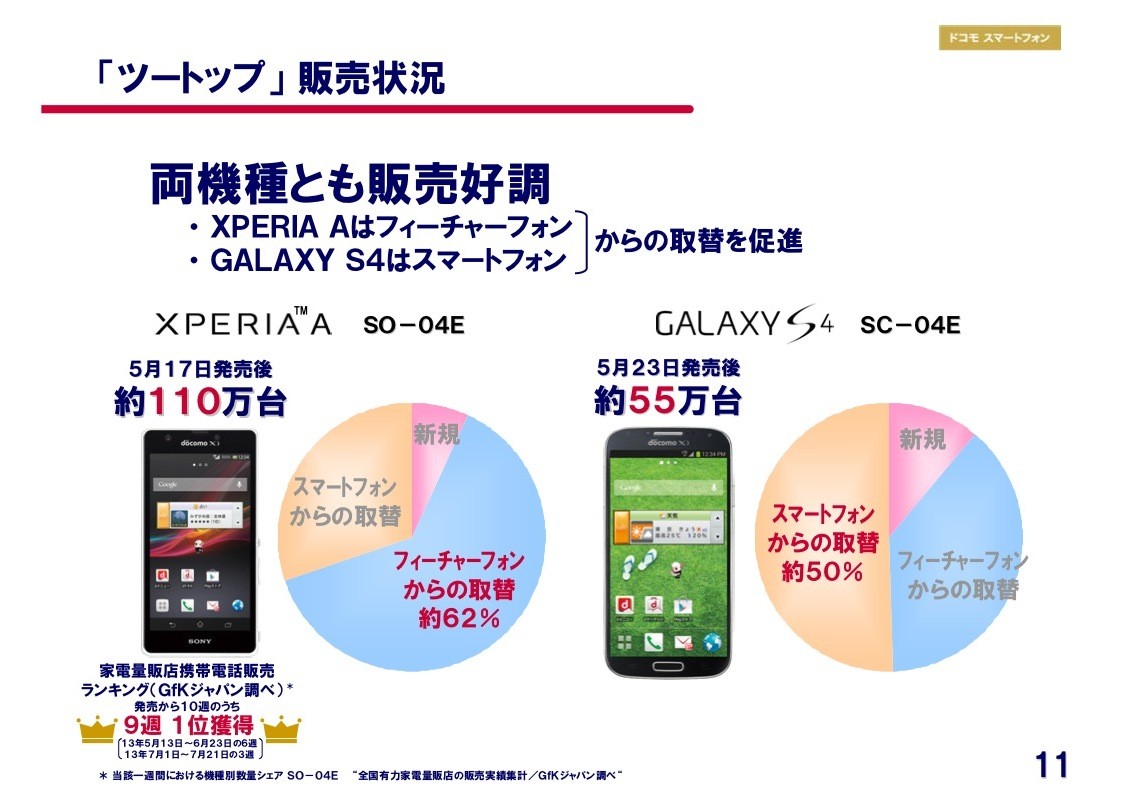 2013年度事業運営方針に基づき、粛々と施策を投入しており、夏モデルで注目となった「ツートップ」 販売状況は、両機種とも販売好調でXperia A SO-04Eはフィーチャーフォン(フィーチャーフォン からの取替が約62%)から、GALAXY S4 SC-04Eはスマートフォン(スマートフォンからの取替が約50%)からの取替を促進し、Xperia A SO-04Eが約110万台(5月17日発売後)、GALAXY S4 SC-04Eが約55万台(5月23日発売後)を販売したということです。