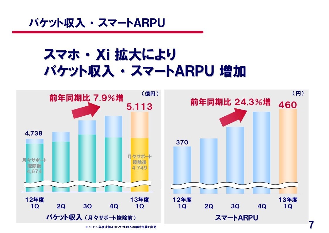一方で、パケット収入およびスマートARPUについても、スマートフォンおよびXiの拡大によって増加しており、パケット収入が前年同期比7.9%増の5,113億円、スマートARPUが前年同期比24.3%増の460億円。
