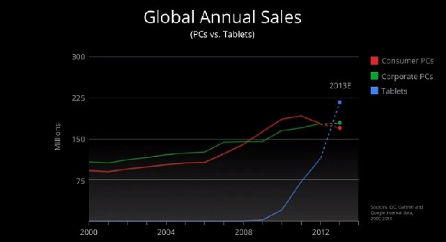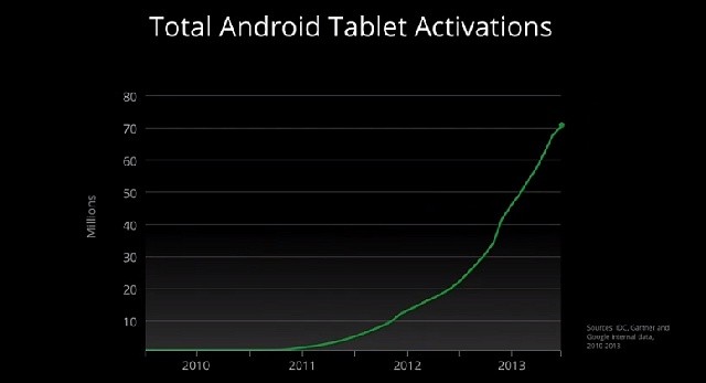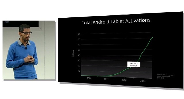 続けて、Pichai氏はグラフを示しながら「パソコンよりもタブレットを利用する人のほうが多くなった。」ことを紹介し、タブレットが急速に普及していること、そして、その半数がAndroidを搭載したタブレットであるとし、Androidタブレットのアクティベーション数が昨年末で4000万近くにまで達し、現在すでに7000万になっていると説明しました。