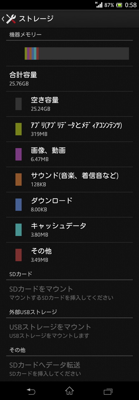 メールやアプリ、画像や動画の保存など、データを保存できる本体の容量を確認したところ、25GB程度あった。製品版では上下する可能性があるが、20GB以上あれば通常のスマートフォン利用には必要十分の空き容量と言えるだろう。