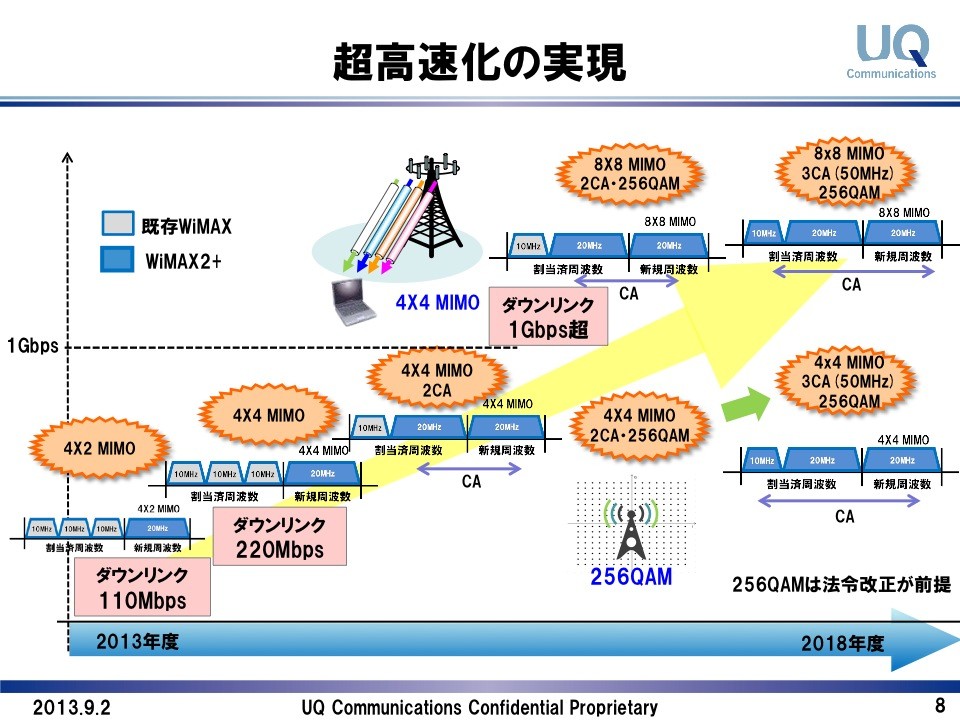 資料には、まず、これまでの2.5GHz帯BWAネットワークにおける周波数帯などの説明が行われています。続いて、WiMAX 2+の計画概要が示されており、従来までにわかっていた通り、10月のサービス開始時には新しく割り当てられた20MHz幅を利用し、2×2 MIMOによって下り最大110Mbpsのデータ通信サービスとなります。また、2014年初頭にはマルチアンテナ技術(MIMO)を4×4にし、下り最大220Mbpsに、その後、現在「モバイルWiMAX」方式で利用している周波数帯のうち20MHz幅をWiMAX 2+に割当、キャリア・アグリゲーション(CA)を行い、変調方式に256QAM(さらなる多値化)、MIMOを8×8に、さらにモバイルWiMAXの残りの10MHz幅もCAで利用し、2017年には下り最大1Gbpsを越えるモバイルデータ通信ネットワークを実現する計画であることが掲載されています。