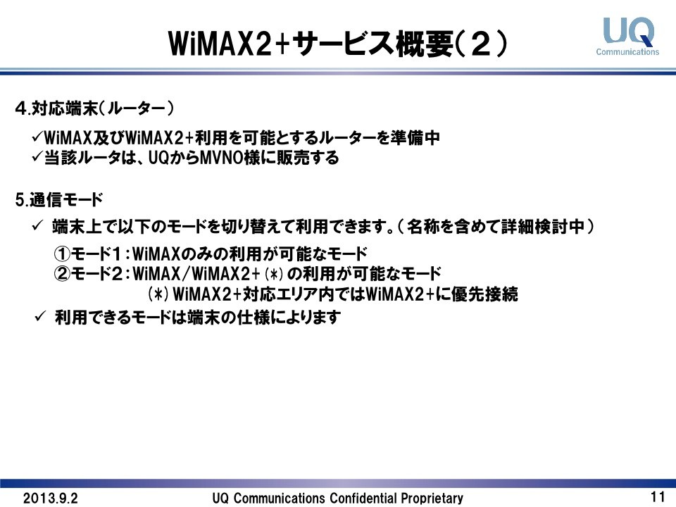 UQコミュニケーションズは4日、今年10月以降に開始予定の「TD-LTE」互換の「WiMAX 2+」方式を利用したデータ通信サービスに対する仮想移動体通信事業者(MVNO)向け説明会を9月2日(月)に実施し、説明会で利用した資料「MVNO様向け説明会資料(2.62MB) [PDF]」を公開しています。