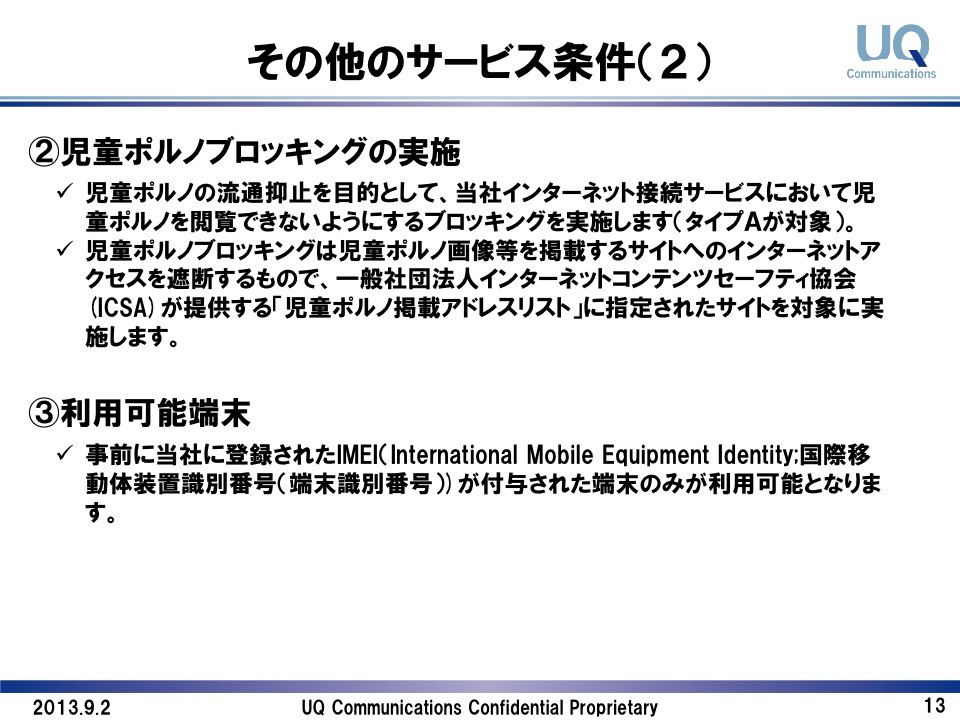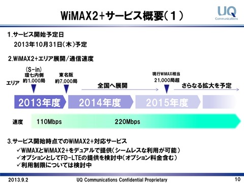 一方で、WiMAX 2+の概要として10月31日にサービス開始予定であることや詳細な基地局設置計画、サービス開始時に既存のWiMAXサービスとのデュアル提供を行うこと、オプションとしてau 4G LTEの提供や利用制限などについては現在検討中であることが示されています。