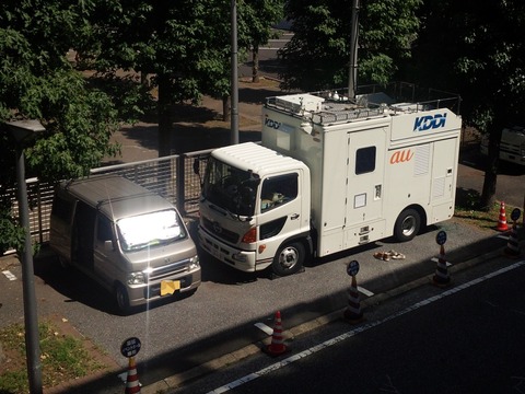 KDDIもau向け4G LTE対応の移動基地局車を送り込んでいます。NTTドコモと同様に、不測の事態に備えて係員が常駐しているしているようです。