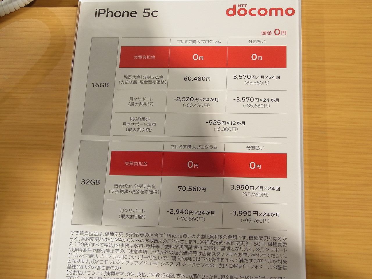 | iPhone 5c | 32GB | 3,990円×24ヶ月 (95,760円) | 70,560円 | 25,200円 | 0円 |